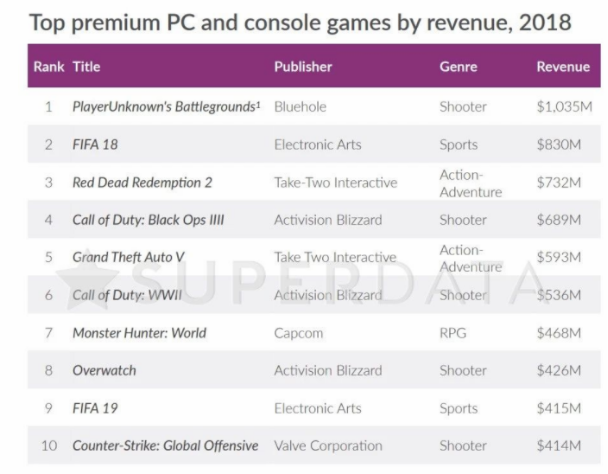 在营收层面,就主机和付费PC游戏领域来说,《绝地求生》2018年全年营收达到了10.35亿美元(约合人民币69.34亿元)。对比之下,2018年《堡垒之夜》的年度营收达到了24亿美元(约合人民币160亿元)。