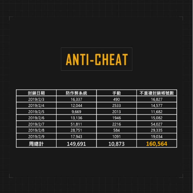 此外,官方还表示,目前游戏的反作弊小组每天需要处理高达3TB容量的游戏日志、60多种作弊日志、以及平均每天超过1000万个的玩家举报。工作人员会从这些庞大的数据中筛选出那些行为明显异常的玩家进行重点验证,如果证明是作弊玩家则会进行封禁处理。