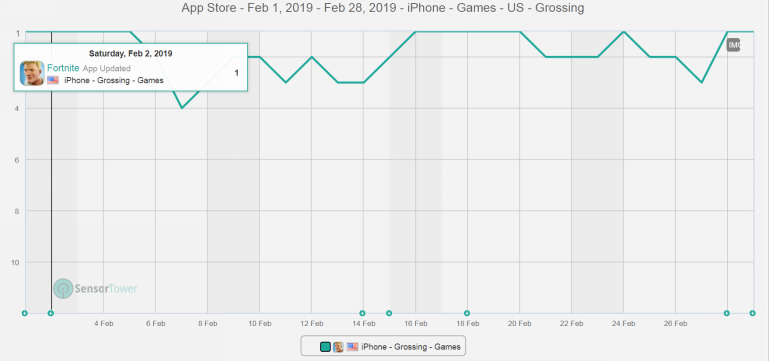 《堡垒之夜》2月美国iOS畅销排行趋势