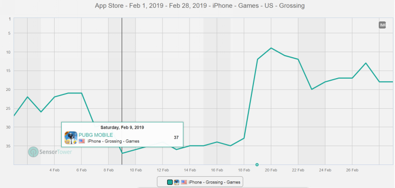 《PUBG Mobile》2月美国iOS畅销排行趋势