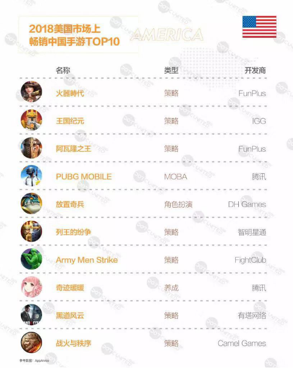 根据《2018年度全球移动互联网市场报告》显示,2018年《PUBG Mobile》拿下了美国市场上畅销中国手游TOP4,仅次于《火器时代》、《王国纪元》以及《阿瓦隆之王》。