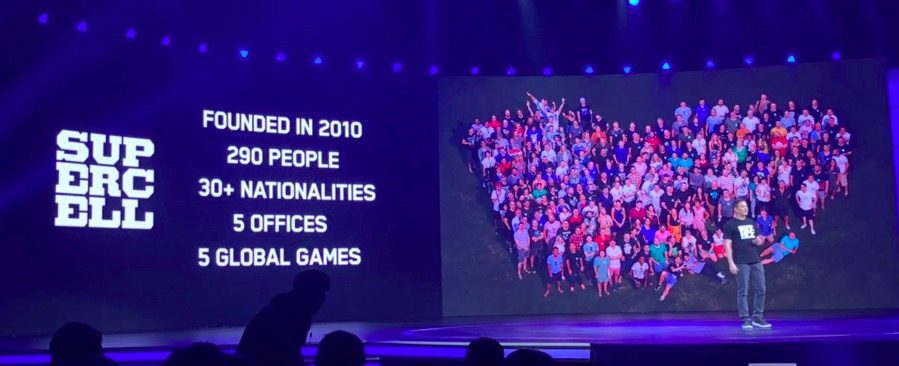 这就是我们,这个图片上几乎集中了我们Supercell公司所有的员工。我之前也说了,我们是一个小公司,来自于芬兰,芬兰距离中国非常遥远,远在北方之境。尤其和北京相比非常远。尽管有这些距离,但Supercell作为一家公司来说是非常全球化的。比如说我们在赫尔辛基的办公室,我们的员工国籍就超过30个,有一半的开发人员都是非芬兰人。