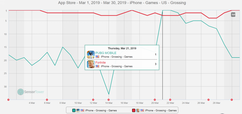 3月《PUBG Mobile》《堡垒之夜》美国iOS畅销排行趋势