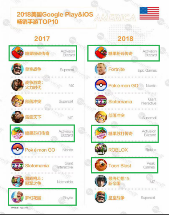 而在美国市场,《糖果传奇》更是连续两年蝉联美国畅销手游冠军宝座。与此同时,该系列的《糖果苏打传奇》亦表现出色,排在榜单TOP6。此外,Peak Games旗下的热门三消游戏《Toon Blast》亦挤进榜单,位列TOP8。