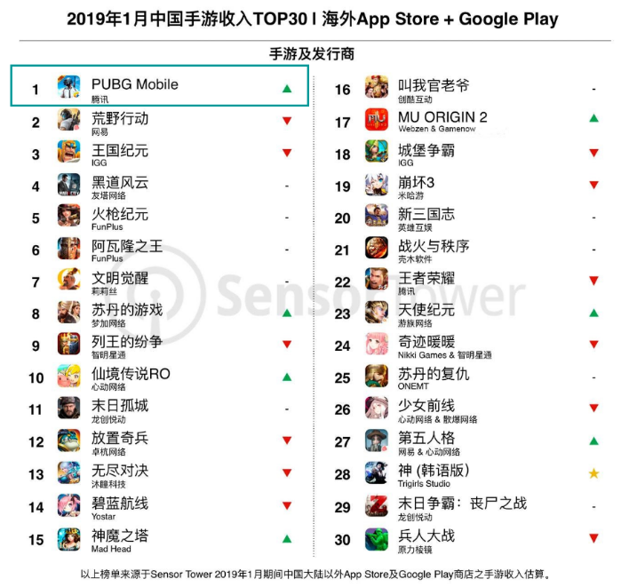 继《堡垒之夜》大获成功之后,另一款“大逃杀”游戏《PUBG Mobile》也开始加入了这一系统。SensorTower数据显示,得益于游戏1月18日开启的Royale Pass第五赛季,《PUBG Mobile》1月期间营收暴增,助力其首次登顶出海收入TOP30。在开放第五赛季后,全球玩家过去一周在《PUBG Mobile》的付费额高达1400万美元。对比赛季开放前一周670万的营收,这一收入是其两倍,并且创下了月流水新高。