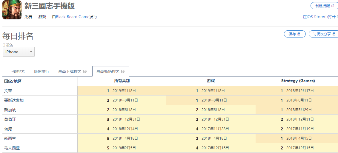 同年12月份,由日本光荣授权的《新三国志手机版》正式上线,游戏在上线后不久就拿下了港澳两个市场App Store游戏畅销榜的TOP1;同时《新三国志手机版》在台湾App Store同样登上了游戏畅销榜TOP4。更值得一提的是,游戏在东南亚地区的文莱,马来西亚,新加坡等地都有不错的表现,甚至一度冲入了葡萄牙和新西兰等的欧洲和大洋洲国家畅销榜头部。而在不久之后,这股“三国热”很快就从上述的这些市场蔓延到韩国市场。