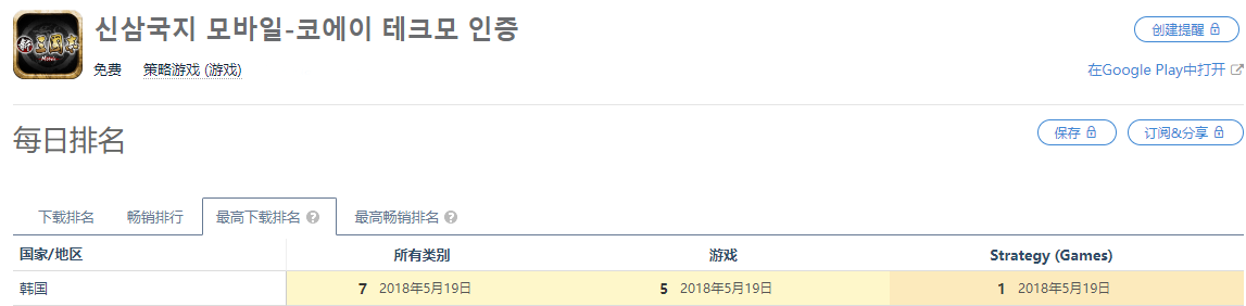 去年5月《新三国志手机版》在韩国市场的表现也相当突出,这款由是光荣正版授权的SLG手游在5月15日登陆韩国市场之后,在韩国Google Play游戏免费榜拿下了TOP5,在畅销榜冲上了TOP11;并同时冲上了韩国App Store免费榜TOP3,畅销榜的TOP6。