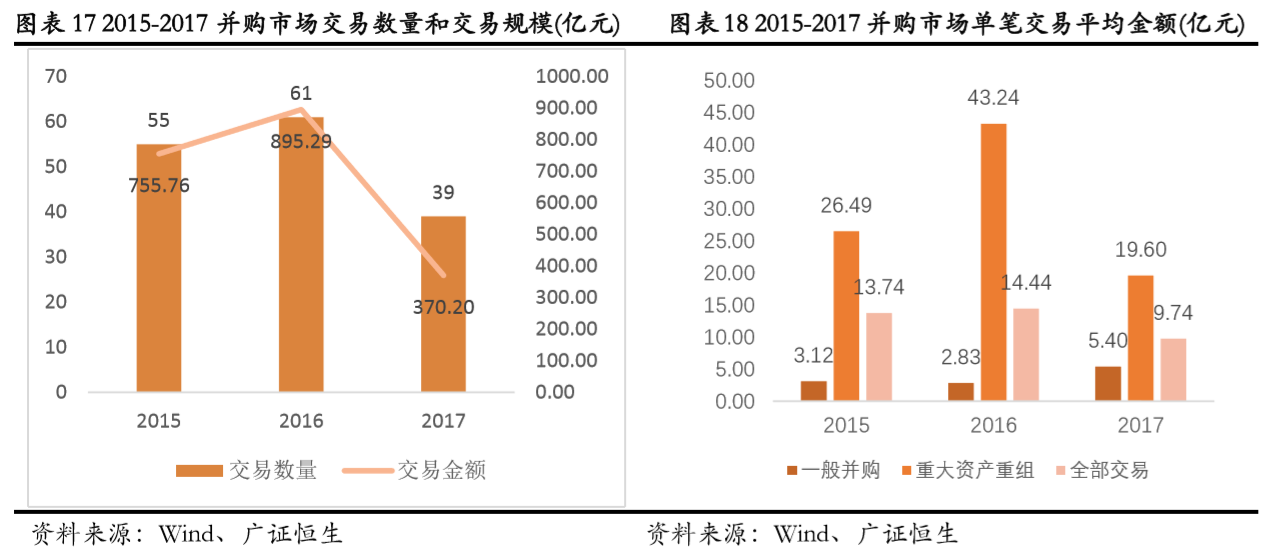 广证恒生曾于2018年1月10日发布游戏行业专题报告称,在2015年到2017年三年间,共有72家A股上市参与155个游戏并购事件。2017年全年交易数量仅为39起,同比减少36.07%,涉及重大资产重组的单笔交易金额由43.24亿元下降至19.60亿元。游戏类资产估值水平持续走低,2015/2016/2017年游戏标的平均动态PE分别为14.30/11.70/9.60。