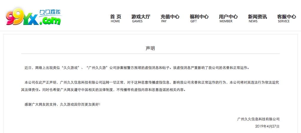 近日,有网传“久久游戏”、“广州久久游”公司涉案被警方围堵的消息,目前该公司已经发表声明,此消息为虚假消息,该公司现在运转一切正常。以下为声明内容: