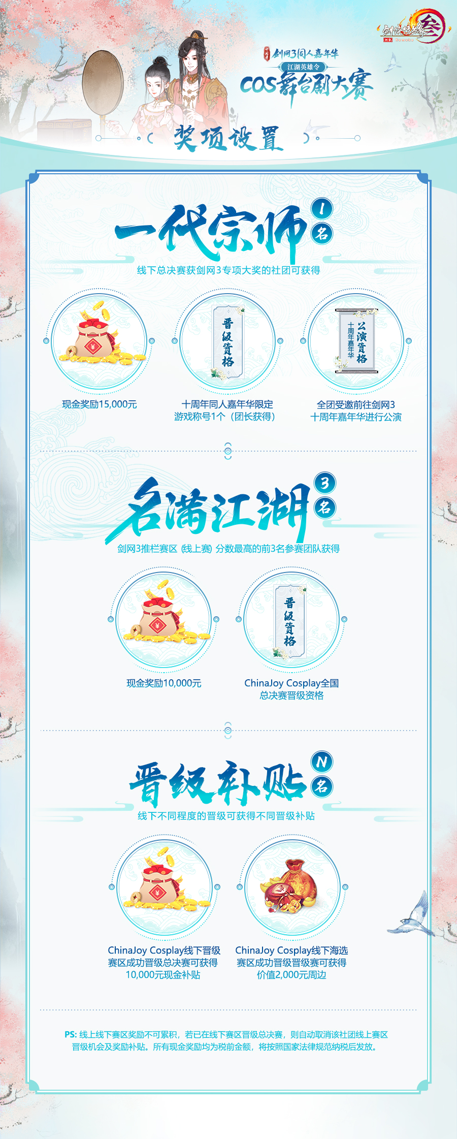 剑网3推栏赛区(线上赛)分数最高的前3名参赛团队可获得【全国总决赛晋级资格】和现金奖励【10000】;线下总决赛更有【15000元】现金大奖和【剑网3十周年嘉年华公演资格】等你来!