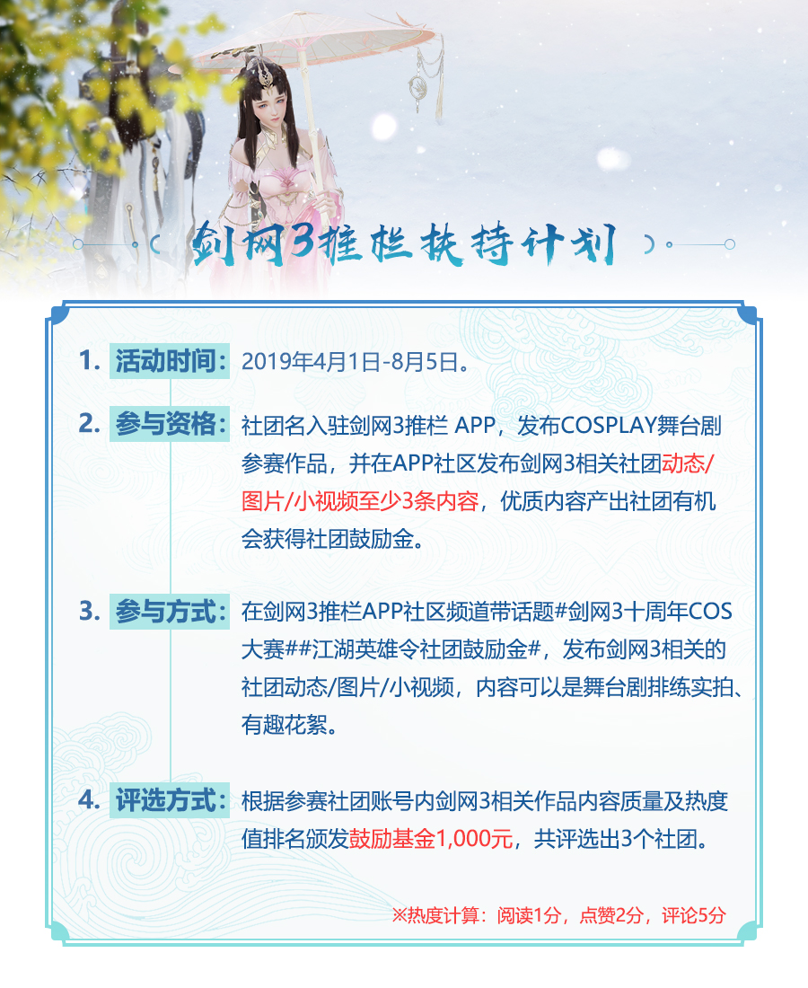 侠士们可以在2019.4.1-2019.8.5期间,以社团名入驻剑网3推栏APP,在剑网3推栏APP社区频道带话题#剑网3十周年COS大赛##江湖英雄令社团鼓励金#,发布剑网3相关的社团动态/图片/小视频至少3条(内容可以是舞台剧排练实拍、有趣花絮),优质内容产出社团有机会获得鼓励基金1,000元。