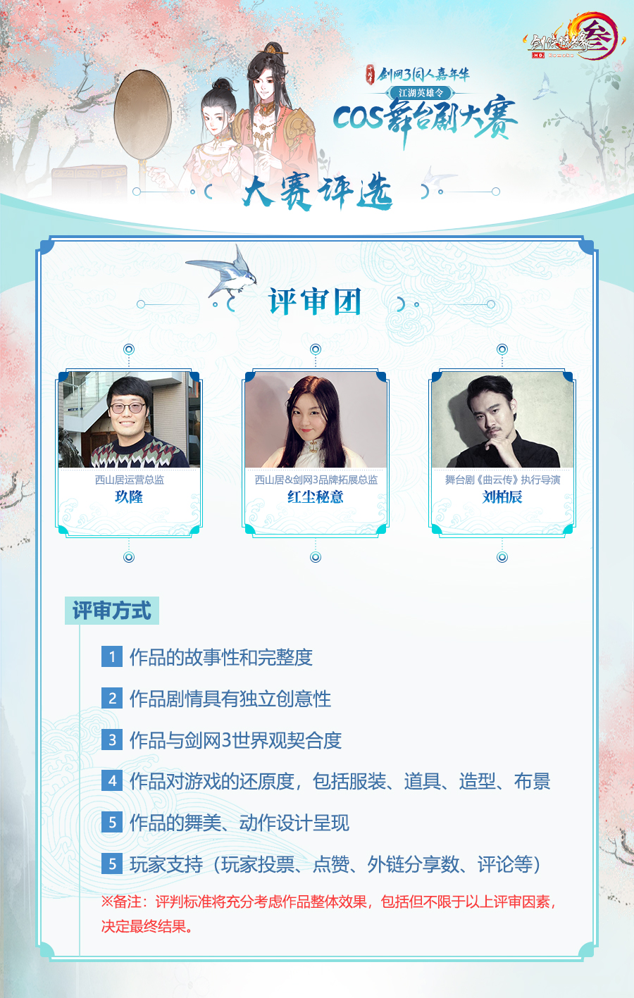 本届剑网3“江湖英雄令”Cos舞台剧大赛,有幸邀请到了西山居运营总监玖隆、西山居&剑网3品牌拓展总监红尘秘意、舞台剧《曲云传》执行导演刘柏辰,各位大咖将一同参与到大赛的评选当中,与侠士们一同见证大赛冠军的诞生!