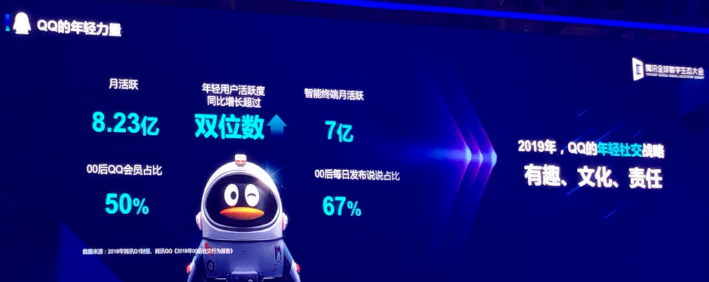 2019年,同样也是QQ整装待发的一年,我们将围绕八亿月活跃用户让QQ平台可以传递有趣生活,传承传统文化,传播社会责任。