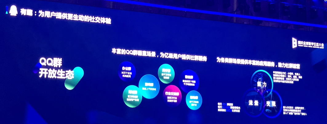 与此同时,我们还重点推出QQ群的开放平台。QQ群作为QQ最特殊的垂直社区,在上面已经有了非常多的垂直行业群,包括游戏、家校群、明星群。我们将把这些流量开放,让应用开发商利用这些特殊的定向的流量为他们提供特殊化服务,比如说可以在家校群里面提供批改作业,在各种群里面提供直接的语音直拨或者是视频直播的能力。