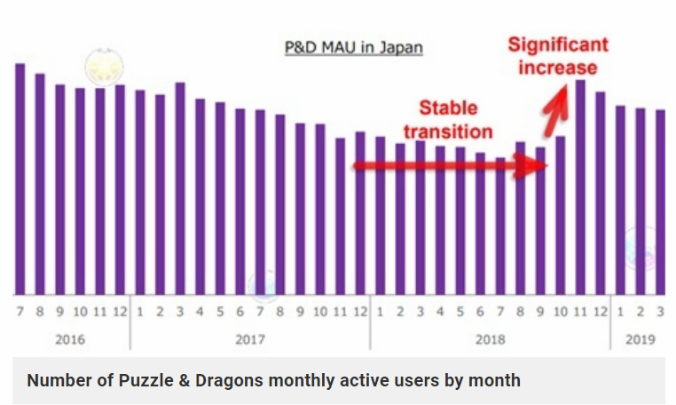 值得一提的是,GungHo公司旗下主力产品《智龙迷城》在2018年11月再度迎来月活新高。数据显示,在去年10月和11月月度活跃用户数量显著增加之后,《智龙迷城》继续保持着较高的人气。自10月和11月高峰期之后,尽管该作月活一直在稳步下降,但仍高于2018年的任何时期。