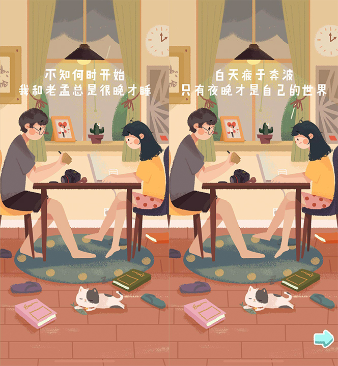 在白日枯燥乏味的工作之后,到了晚上也选择熬夜的老孟和小鱼,这正是许多人的现实生活写照吗。每日三四点一线的在都市中奔波,没有选择自己生活方式的能力,到了晚上才拥有自己的快乐,旅行串串仿佛将玩家的生活情景再现。