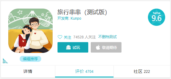 顺带一提,《旅行串串》的测试版本还在TapTap超过4700个玩家评论中拿下9.6分,考虑到TapTap用户对于游戏的测试版本相对苛刻的分数评价,一定程度上也能够看出这款游戏在设计和体验上有着它的独到之处。