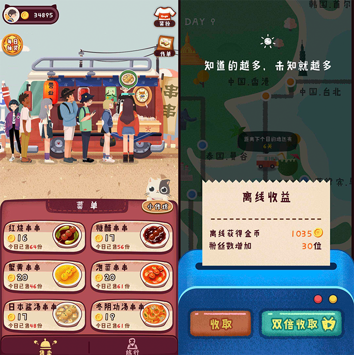 值得一提的是,《旅行串串》还加入了放置玩法,玩家离线的过程中同样可以获得销售串串的累计金币收入,将游戏“肝”的程度降到最低。