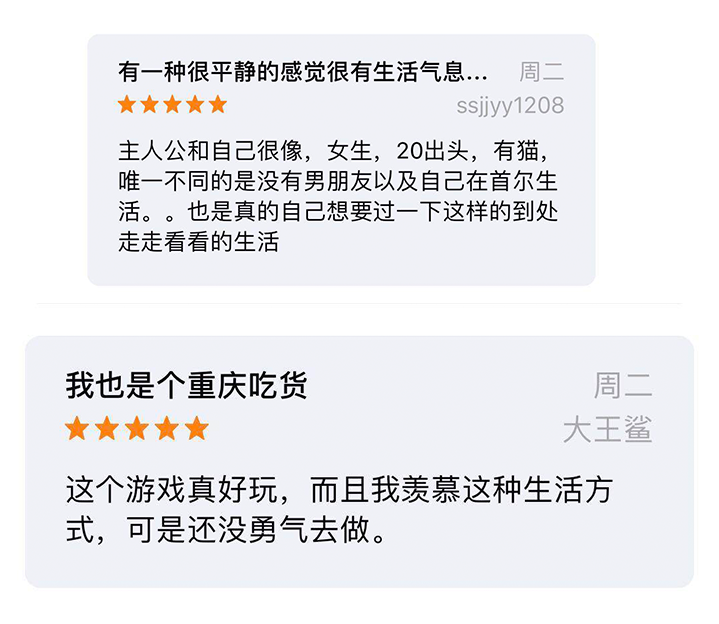 正如玩家评论所说:自己也想要过一下游戏中这样走走看看的生活,《旅行串串》获得成功的关键也正是因为其对真实感和现实诉求的表现。游戏一开始女主小鱼的独白便引起了大多数玩家的共鸣,不知何时开始,总是很晚才睡,只有夜晚才是自己的世界。