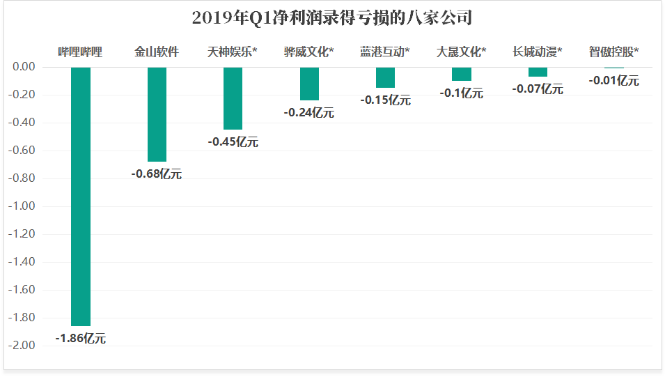 与去年同期相比,我们发现净利润出现亏损的公司数量从3间增加到8间。就亏损金额而言哔哩哔哩依然稳居“榜首”,期内公司净亏损约为1.96亿元,较上年同期的净亏损5780万元扩大238%。虽然净亏损进一步拉大,但哔哩哔哩2019年Q1的经营情况仍有许多亮点,例如平均月活跃用户数首次破亿以及游戏业务实现8.7亿元的营收,创下历史新高。