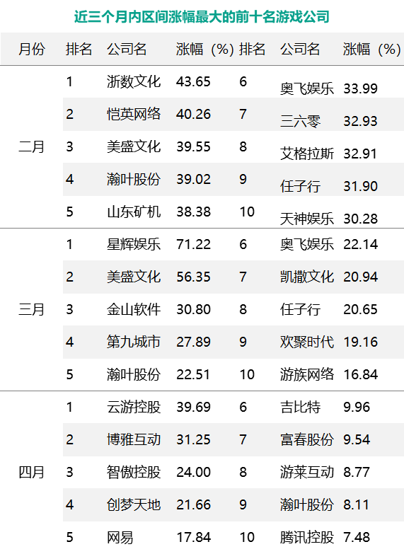 其中二月上涨幅度最大的三间公司为浙数文化,恺英网络以及美盛文化,分别上涨43.65%,40.26%以及39.55%;而在三月份中,星辉娱乐,美盛文化以及金山软件期内分别上涨了71.22%,56.35%和30.80%。