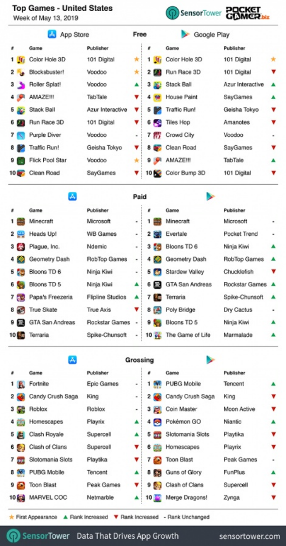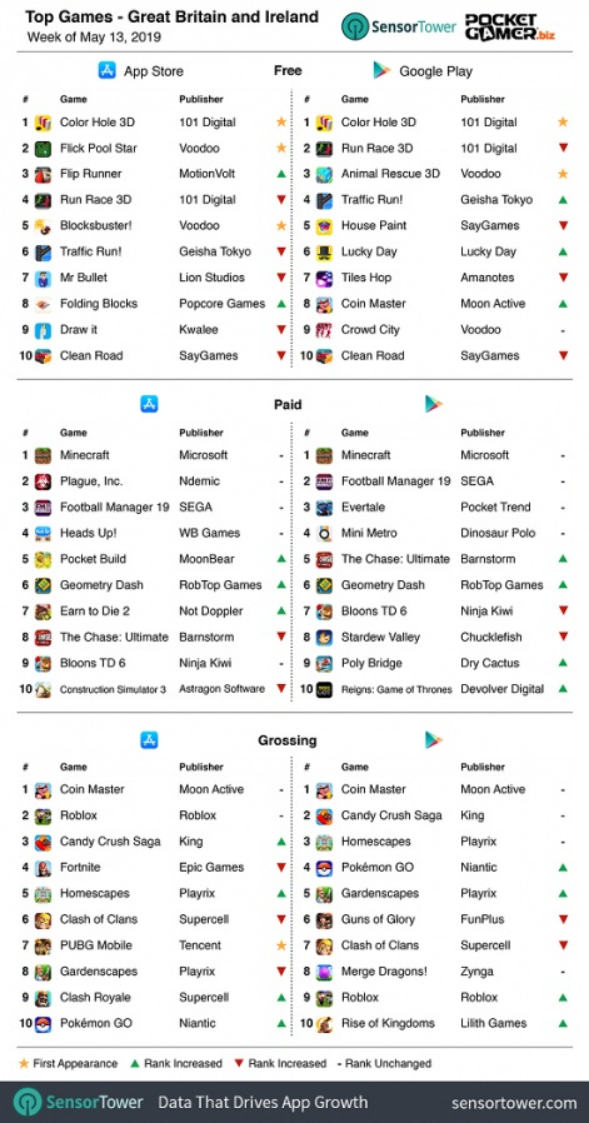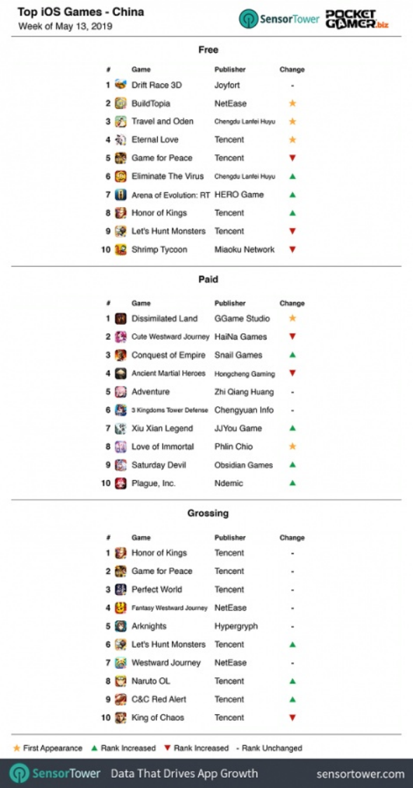 为了让业内人士更好地了解全球手机游戏行业,近期外媒PocketGamer与市场研究机构SensorTower展开了一项调研合作,对全球主要国家的每周手游榜单(免费榜、付费榜以及畅销榜)进行了整理排名。目前,主要报导的三个重点国家和地区分别为美国、英国及爱尔兰、中国(仅iOS)。本周榜单的时间周期为5月13号-5月19号。