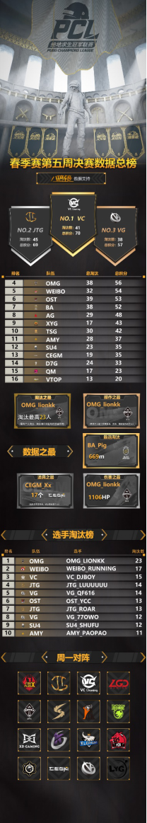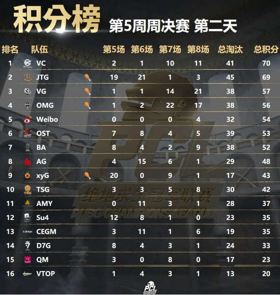 PCL冠军联赛第五周的比赛昨天正式结束,首日比赛结束后微博与VC取得了大幅领先,不过第二日的比赛风云突变,后续队伍奋起直追,JTG半只脚已经踏上了周冠军的宝座,然而VC战队凭借着最后一局比赛的出色发挥,压哨绝杀,以一分的优势拿下了自己的第二个周冠军!
