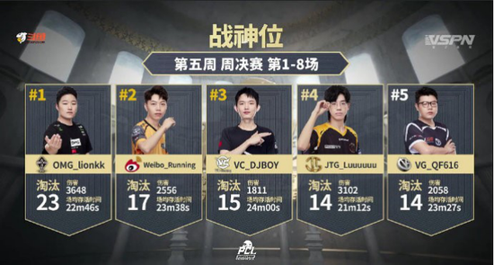 微博战队在第一天打出了统治级别的数据,running个人也理所当然的登上了战神位,VC战队耳朵也同样位列其中。但最可怕的选手莫过于昨天最后两局暴走的lionkk,狮王在最后两局都拿下了个人9淘汰,以一己之力帮助OMG从后置位一跃成为第四。累计23个淘汰拿下本周战神位NO.1