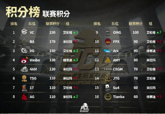 凭借着第二个周冠军,VC战队总积分达到了230分,已经锁定了PCL前五的位置,也仅有BA、VG、微博还有撼动其冠军的可能性,最后一周的比赛将为PCL春季赛一锤定音。