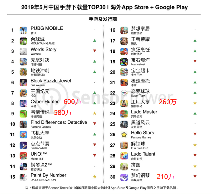 5月手游出海下载TOP30中新入榜产品共5款,分别是海彼网络《弓箭传说》、DailyInnovation《Paint By Number》、猎豹移动《工厂大亨》、Fun Free Fun《解锁球》以及易娱网络《梦幻钢琴》。入围的新游数量上和上个月保持一致,不过从这几个月的新增游戏情况来看,品类无疑更加多元化,甚至一些细分品类也在海外市场找准了目标用户,取得了不错的成绩。