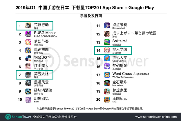 在SensorTower发布的2019年Q1日本市场出海游戏下载榜上,网易旗下的《第五人格》、《荒野行动》和《非人学园》3款作品杀入了TOP20。据手游那点事统计,在今天的日本iOS游戏畅销榜TOP100中,有3款游戏都来自网易旗下,这个数量已经压倒不少日本本土的厂商。毫无疑问网易已经成为了日本市场最具人气,而且最能赚钱的中国出海厂商。