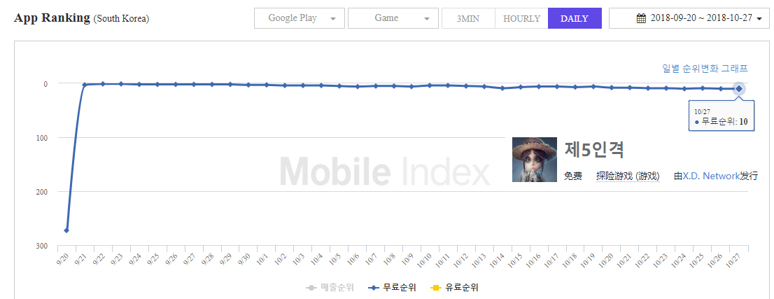 在竞技类领域,这个组合也在海外市场取得了相当亮眼的成绩。网易旗下的王牌作品《第五人格》也在去年9月登陆韩国市场后成功登上了韩国Google Play游戏下载榜TOP1宝座,并坚守在TOP10之内超过1个月的时间。