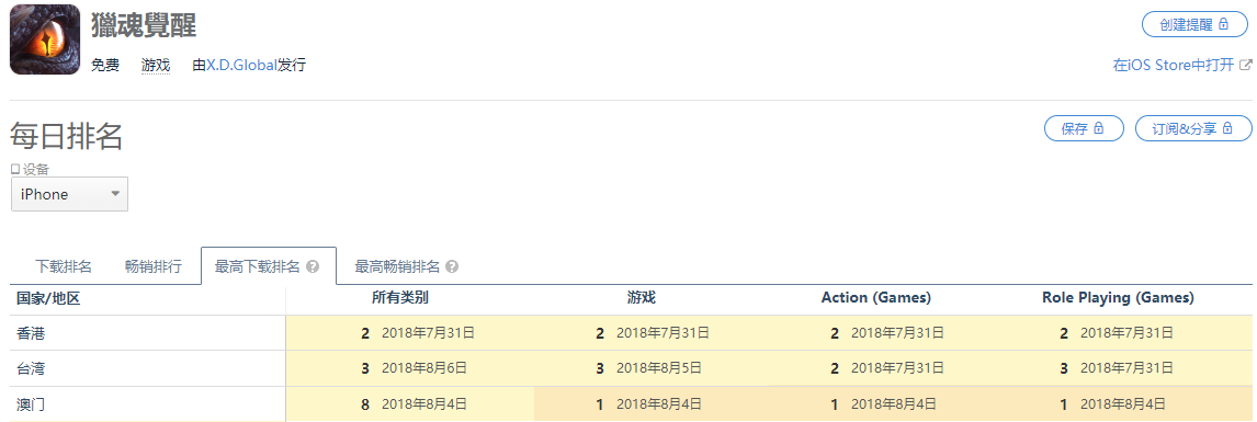 去年7月,这个组合开始朝着海外ARPG手游市场进军。当时《猎魂觉醒》在港澳台市场风别登上了iOS游戏下载榜的TOP2、TOP1和TOP3,在畅销榜则是分别拿下了TOP8、TOP2和TOP10。