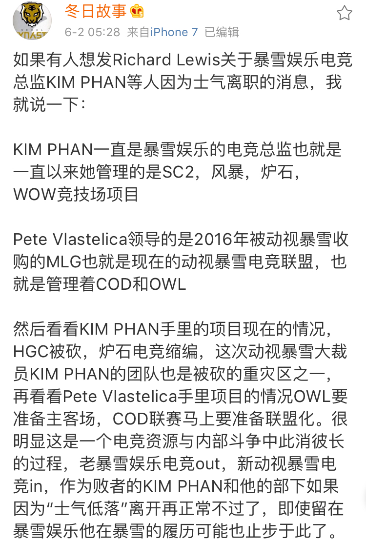 这个消息在月初时就有传闻,微博上有经常爆料暴雪相关动态的博主@雪暴君也认为,Kim Phan离职在意料之中,“意外的是她居然还坑了这么久”。