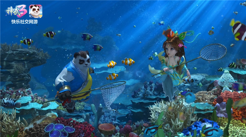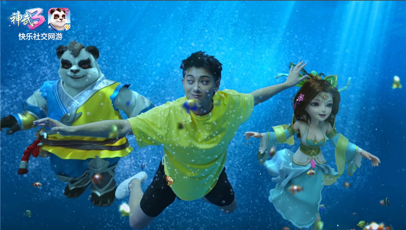 在海底,各式各样的鱼群五彩斑斓,白无忧、凌霜月持鱼网捕鱼,正是《神武3》手游最新推出的暑期全新“深海捕鱼”玩法。三人一行骑着坐骑“幻彩蘑灵”,一同畅游海底,乘浪而出,水花飞溅。随后,黄子韬邀请观众畅玩《神武3》暑期活动,绚丽的游戏内容视觉特效令人惊艳。