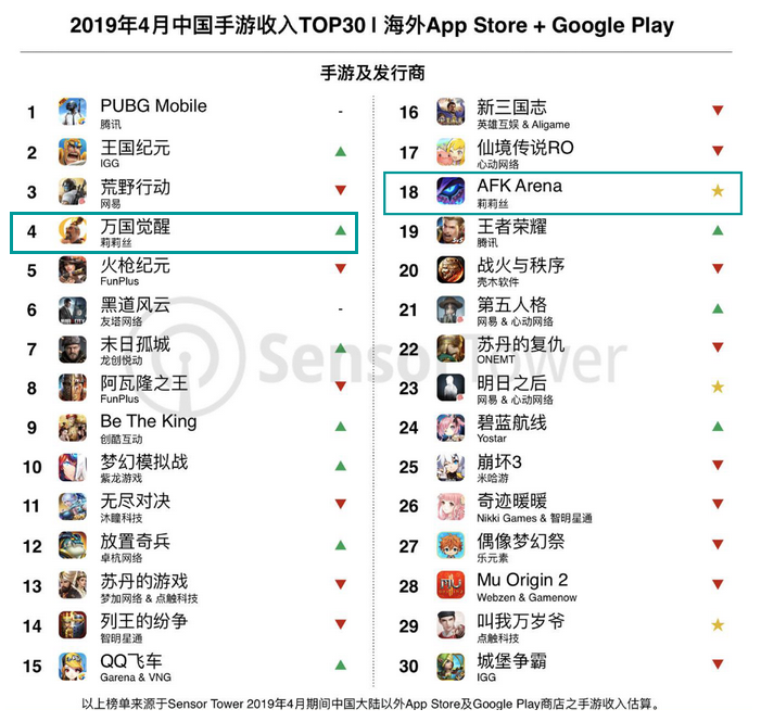 莉莉丝在出海方面也早有建树,《剑与家园》就曾拿下全球97个市场的iOS游戏畅销榜TOP10。不过近一年来,它在出海市场又取得了新的成绩,旗下SLG《万国觉醒》和放置类《AFK Arena》更是成为2019年上半年的“出海黑马”。