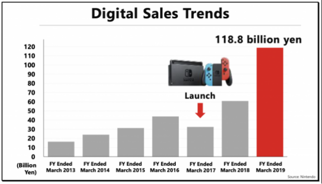 与此同时,自2017年3月Switch主机发售以来,任天堂旗下的数字游戏销售额一直在不断增长。本财年所有任天堂平台的数字游戏销售总额首次超过1000亿日元,达到1188亿日元(约合10.6亿美元)。对比上一个财年,这一销售数据几乎翻了一番。任天堂指出,这一业绩增长主要归功于Switch主机的亮眼表现。