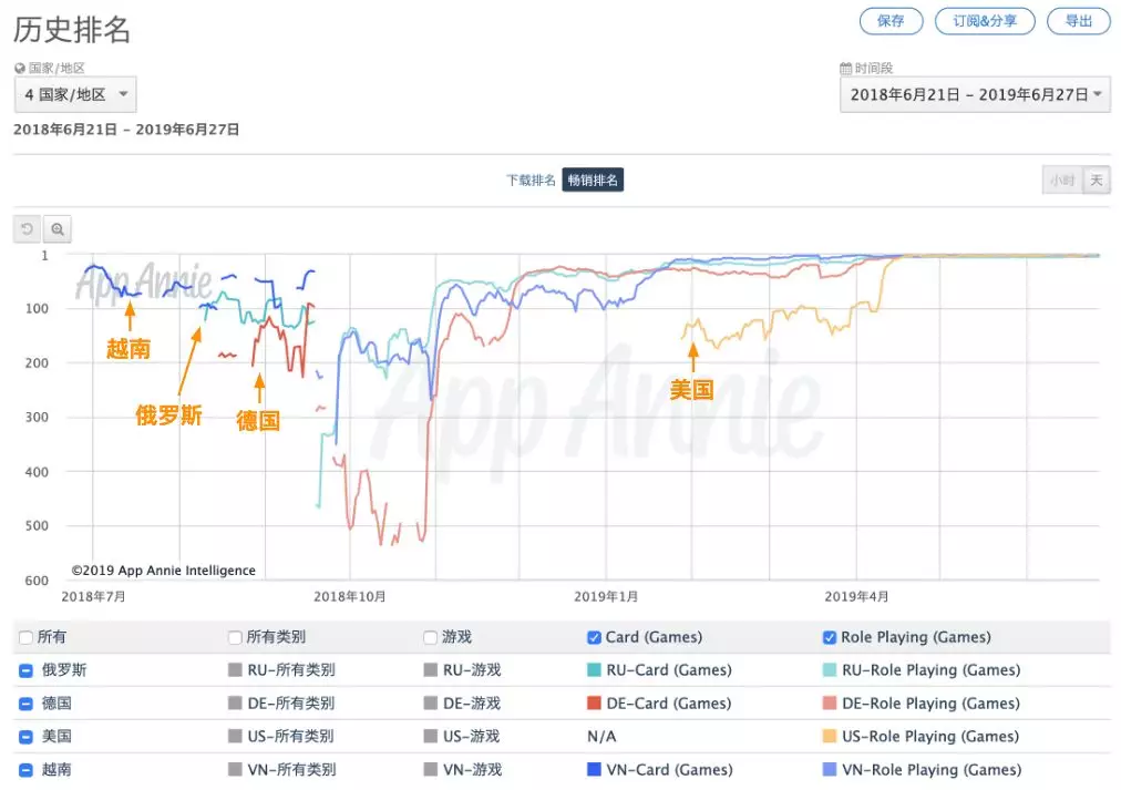 值得一提的是,在摸爬滚打中不断成长的《剑与家园》,出海后表现十分强劲。据App Annie显示,它曾合计进入126个市场的iOS & Google Play游戏畅销榜Top10,其中在欧洲和东南亚市场的表现尤为亮眼。
