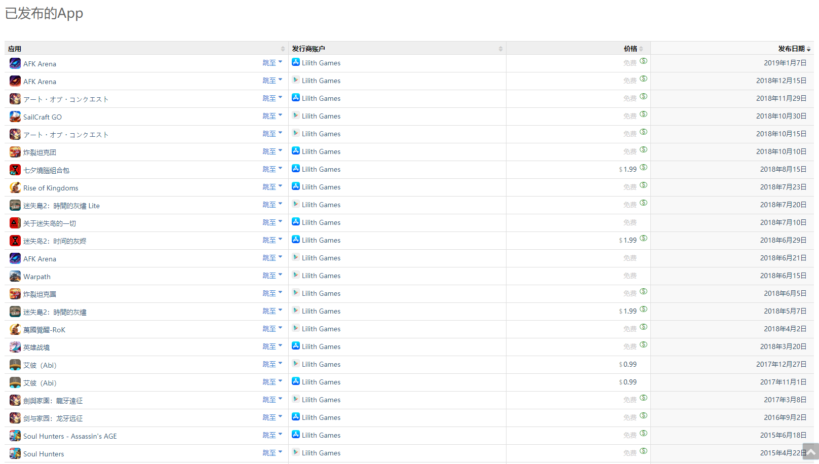 实际上,除了《小冰冰传奇》《剑与家园》《万国觉醒》《AFK Arena》四款代表作之外,据App Annie显示,自2015年4月起,莉莉丝的发行游戏已超过17款,其中10款仍在运营,7款则已下架。