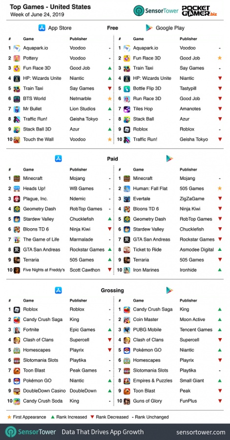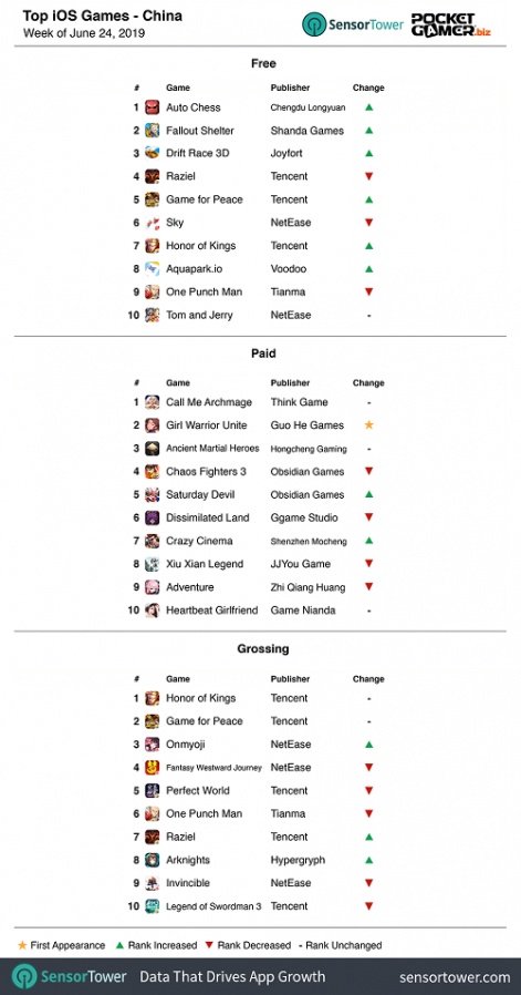 为了让业内人士更好地了解全球手机游戏行业,近期外媒PocketGamer与市场研究机构SensorTower展开了一项调研合作,对全球主要国家的每周手游榜单(免费榜、付费榜以及畅销榜)进行了整理排名。目前,主要报导的三个重点国家和地区分别为美国、英国及爱尔兰、中国(仅iOS)。本周榜单的时间周期为6月24号-6月30号。