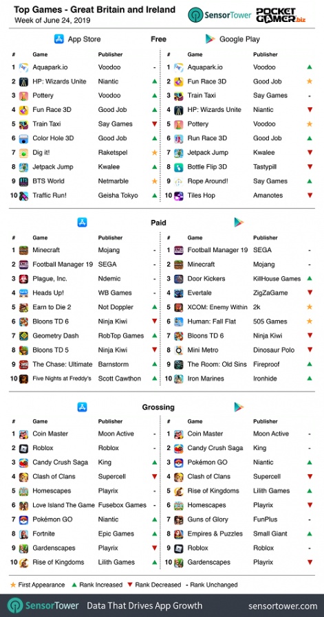在英国及爱尔兰地区,《哈利波特:巫师联盟》和《BTS World》均延续了其在美国市场的傲人战绩,分别排在该地区iOS免费榜第2和第9。