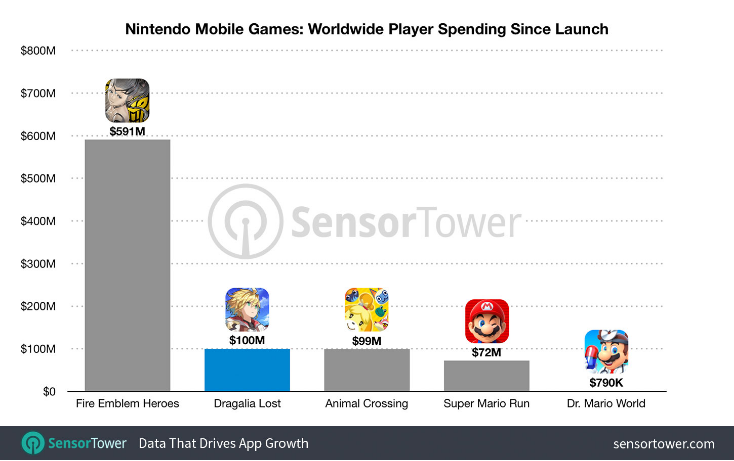 对比之下,《失落的龙约》这款游戏的累计营收比《动物之森:口袋营地》要高出100万美元;但是该作仍以近5亿美元的收入落后于最卖座的《火焰纹章:英雄》。