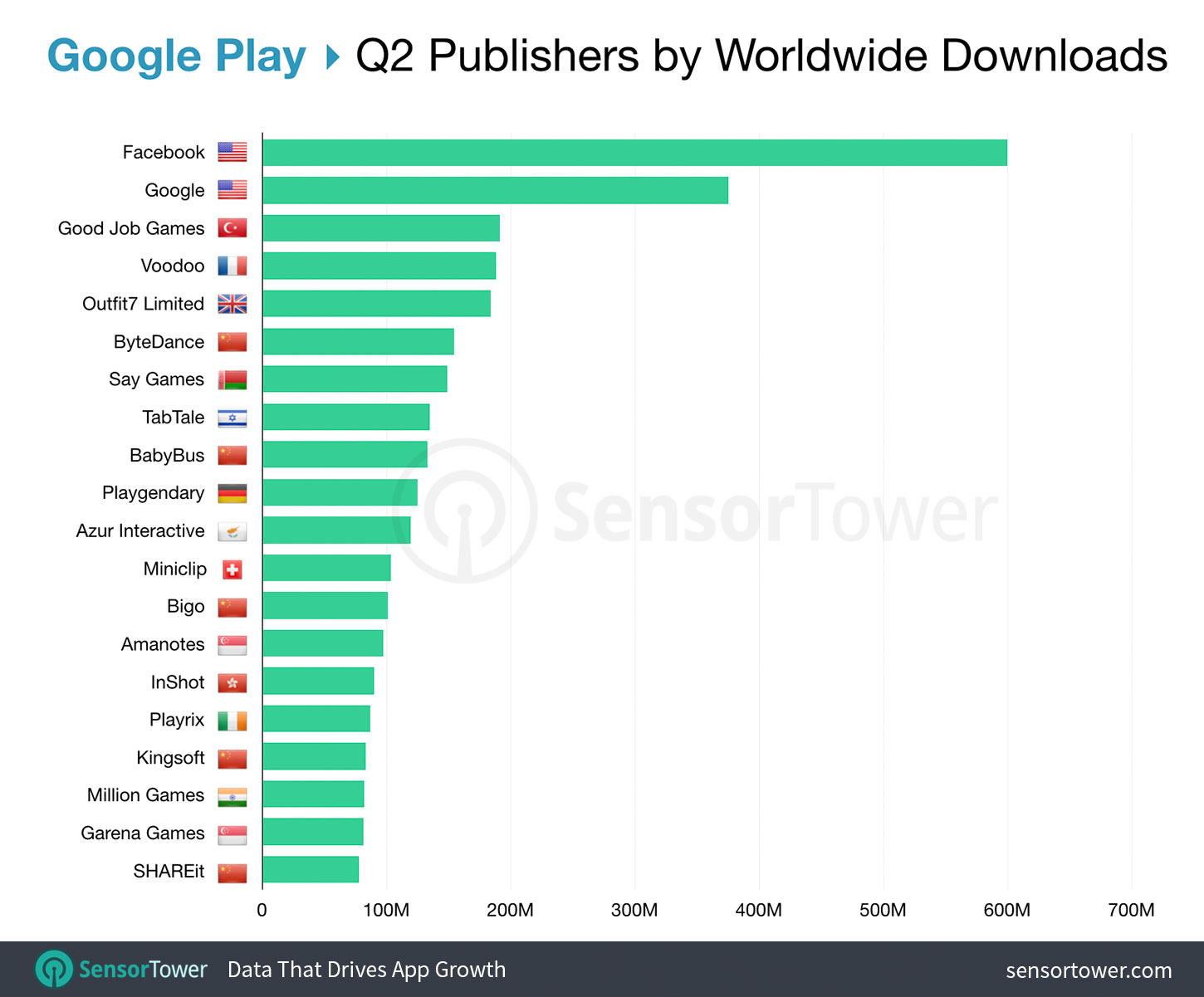 Q2期间,在Google Play榜单,Good Job Games超越Voodoo排在移动应用下载第3、手游下载第1。紧随其后的是Voodoo(第4)和Outfit7(第5)。