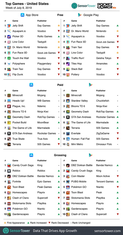 为了让业内人士更好地了解全球手机游戏行业,近期外媒PocketGamer与市场研究机构SensorTower展开了一项调研合作,对全球主要国家的每周手游榜单(免费榜、付费榜以及畅销榜)进行了整理排名。目前,主要报导的三个重点国家和地区分别为美国、英国及爱尔兰、中国(仅iOS)。本周榜单的时间周期为7月8号-7月14号。