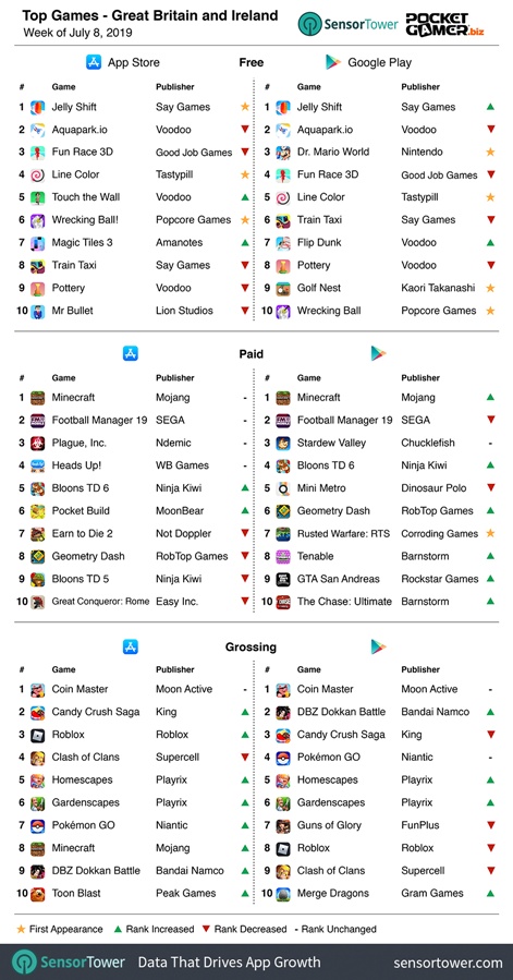 在英国地区,任天堂旗下的《马里奥医生:世界》成功入围Google Play免费榜第3,但却未能挤进iOS免费前十。与此同时,Voodoo、Say Games均延续了其在美国榜单的亮眼战绩,旗下共计分别有3款、2款游戏入围iOS免费前十。