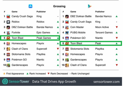 在三消手游领域,除了《糖果传奇》King、《梦幻花园》Playrix,《Toon Blast》发行商、土耳其游戏厂商Peak Games亦吸金强劲、战绩亮眼。
