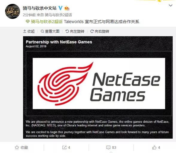 8月3日晚《骑马与砍杀》中文站官宣:开发商Taleworlds宣布正式与网易游戏达成合作关系,Taleworlds表示很高兴和网易游戏开启这段旅程,期待双方能在未来多年取得成功。