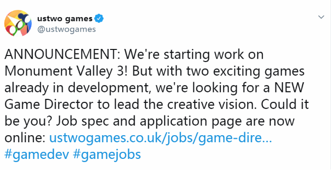 继《纪念碑谷》和《纪念碑谷2》之后,目前《纪念碑谷3》续作也正在积极筹备中。近日,根据英国独立游戏工作室Ustwo发布的推文信息,目前该工作室正在制作《纪念碑谷》续作《纪念碑谷3》,并将招聘一名新的创意总监进行项目领导。除此之外,该工作室没有透露更多的详细信息。