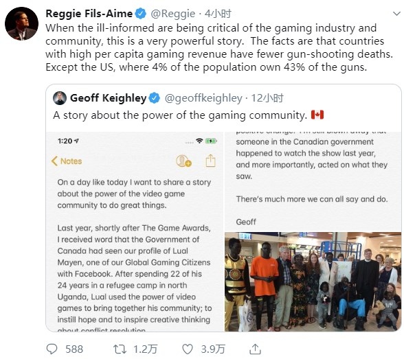 对此,TGA创始人Geoff Keighley分享了一段游戏把人们聚到一起来的故事,而前任天堂美国总裁Reggie Fils-Aime在自己的推特上感叹,称许多人都因为不了解而在抨击游戏,游戏产业人均收入更高的国家,一般因为枪击案致死的人都会更少,除了一个例外:美国,因为美国4%的人口拥有了43%的枪支。