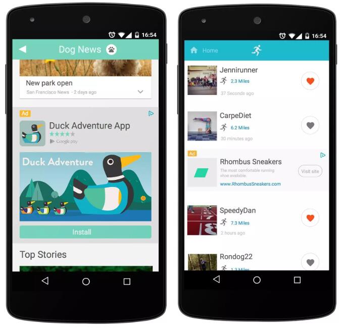 原生广告在视觉形式上与广告投放到的应用内容界面相契合,可为用户带来浑然一体的体验。原生广告所展示的内容不仅与用户极为相关,还与周围的应用内容融为一体,既提供了价值,又能改善用户体验。借助 AdMob 的原生广告格式,发布商能够呈现与内容结合得天衣无缝的广告,或在广告中充分利用滑动手势和 3D 动画等应用功能。通过原生广告技术,你可以充分利用 Android 和 iOS 上的原生代码以高度定制的方式呈现广告,而不再像投放传统的横幅广告时那样只能采用方框形式。